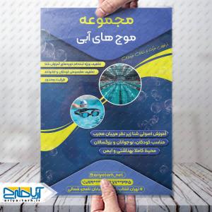 طرح لایه باز تراکت مجموعه آبی, تراکت موج های آبی, فایل psd تراکت استخر, تراکت آموزش شنا, تراکت مجموعه تفریحات آبی, تراکت آبی زرد سرمه ای, طراحی تراکت ورزشی آریاطرح