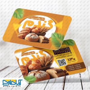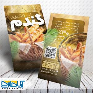 فونتها متناسب با فضای نانوایی و صنایع غذایی انتخاب شدهاند و چینش عناصر ساده، منظم و چشمنواز است تا اطلاعات تماس بهوضوح دیده شود.